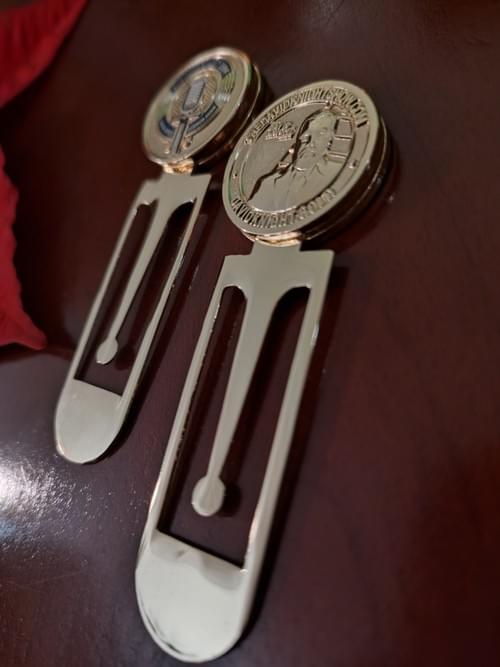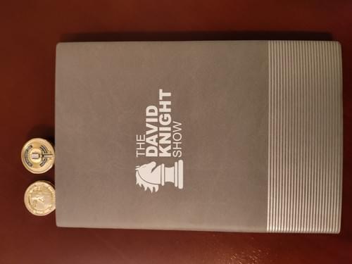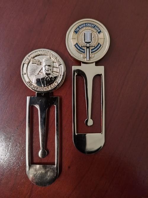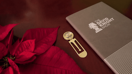 This high quality, embossed metal bookmark, with vivid painted details on one side, is sold as a complete packaged with a beautiful faux leather David Knight Show branded notebook.